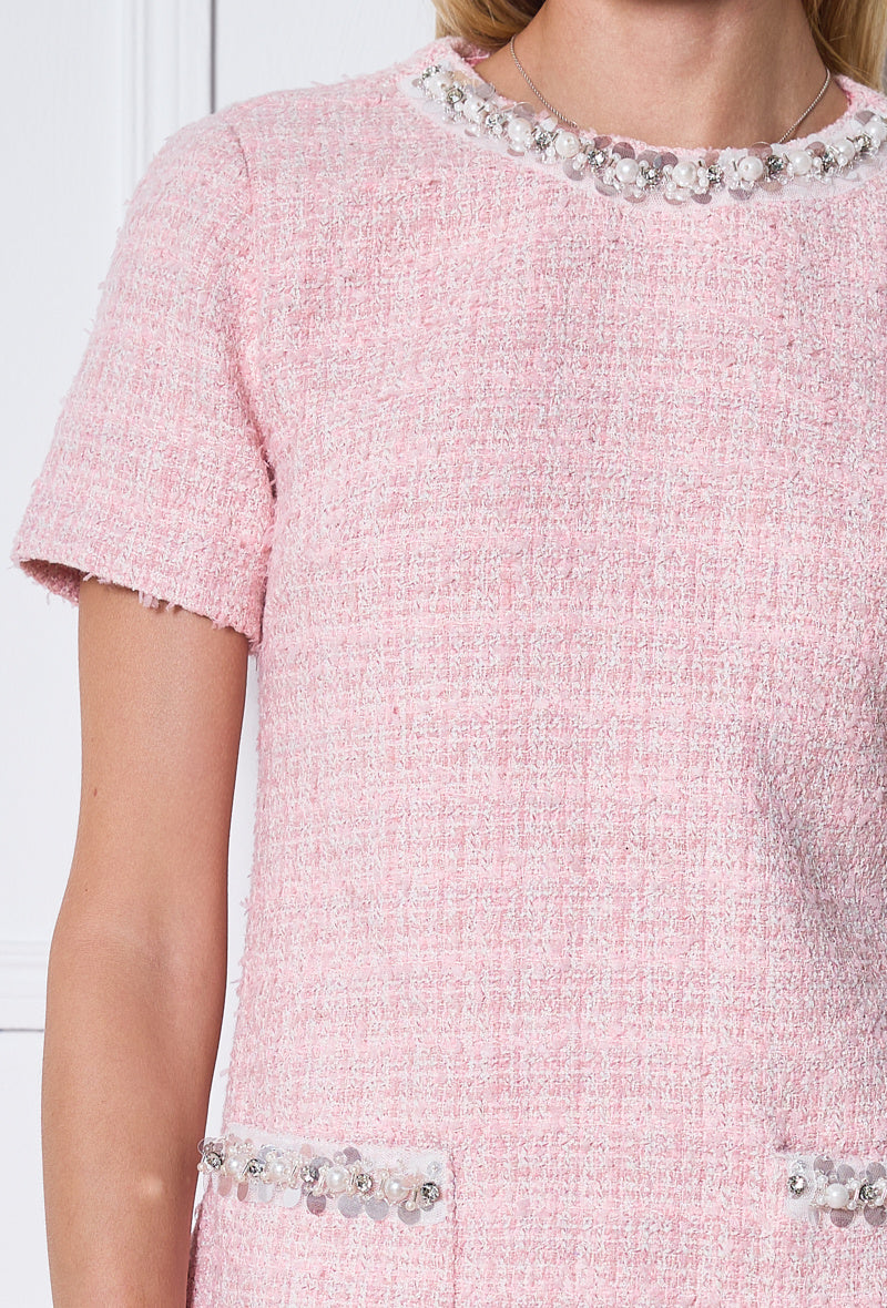 *Pink tweed short sleeves dress with silver beaded sequins twisted neckline detail