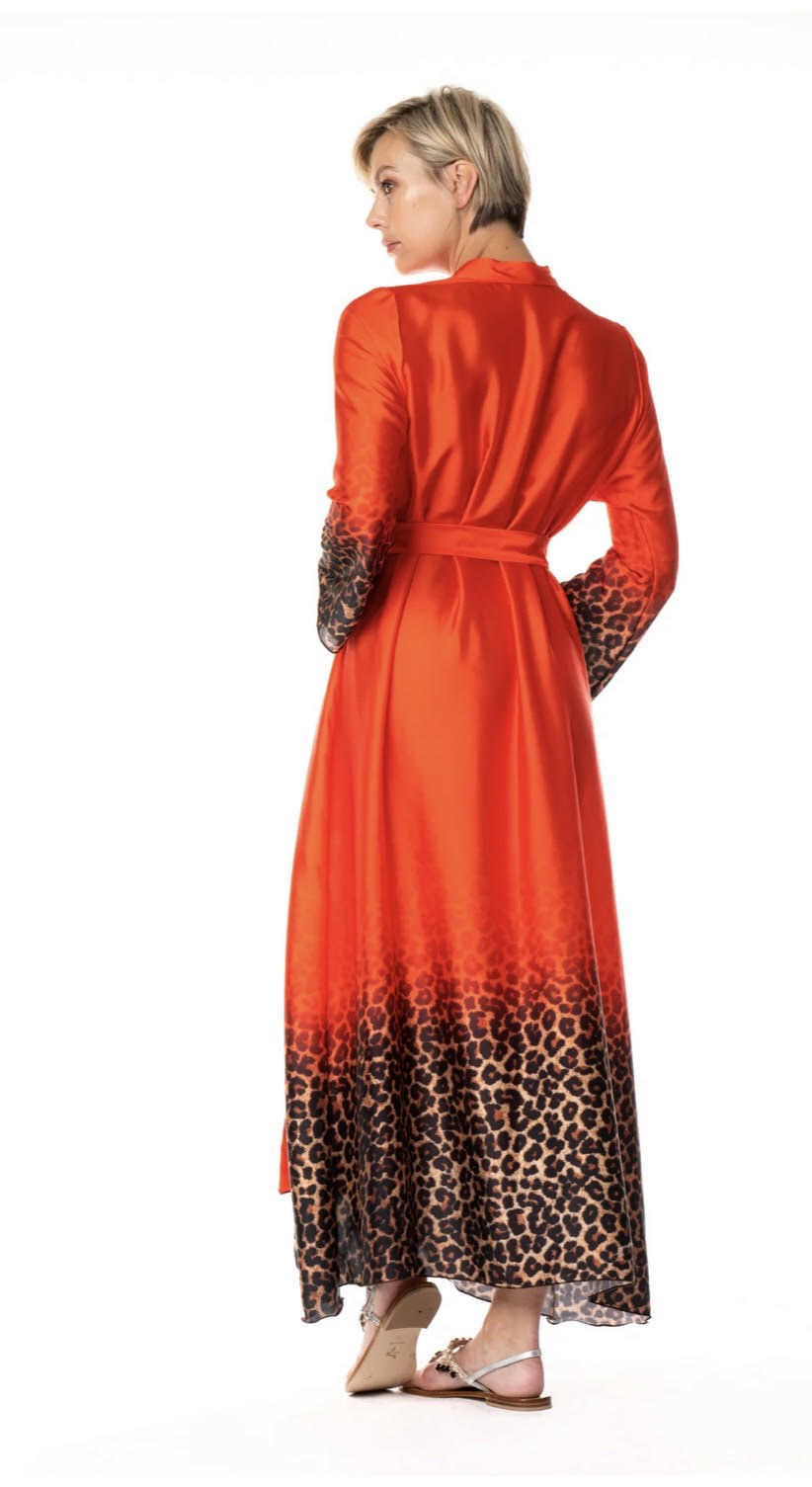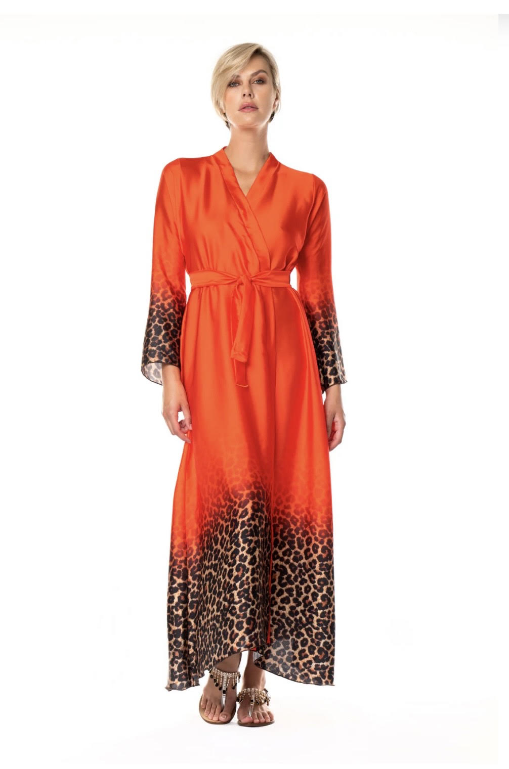 *Gradient vibrant orange and animal print long silky kimono with belt