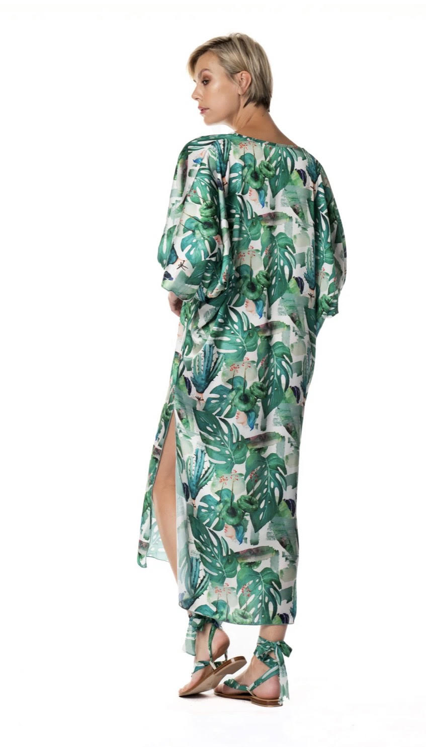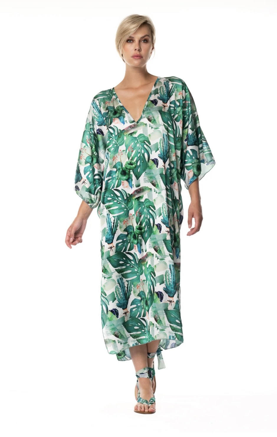 *Vestido kimono con estampado de seda de hojas verdes tropicales de caftán