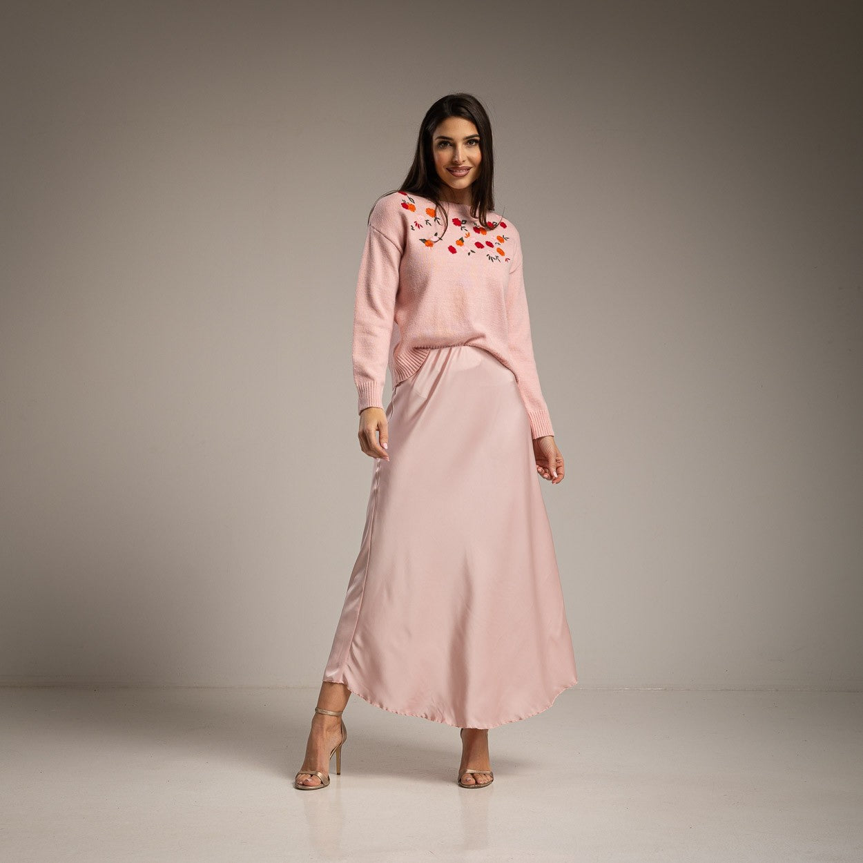 Light pink knit sweater embroiedered with colorful red orange and pink flowers