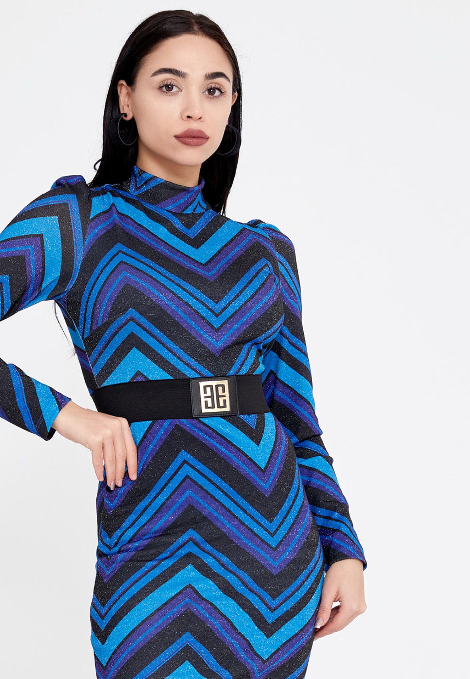 *V geometric blue lurex patern dress with long sleeves and black gold logo belted