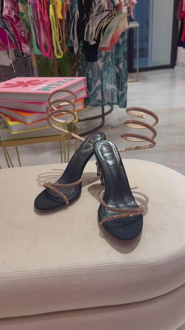*Crystal brown strappy heel with twisted ankle strap, black heel and sole