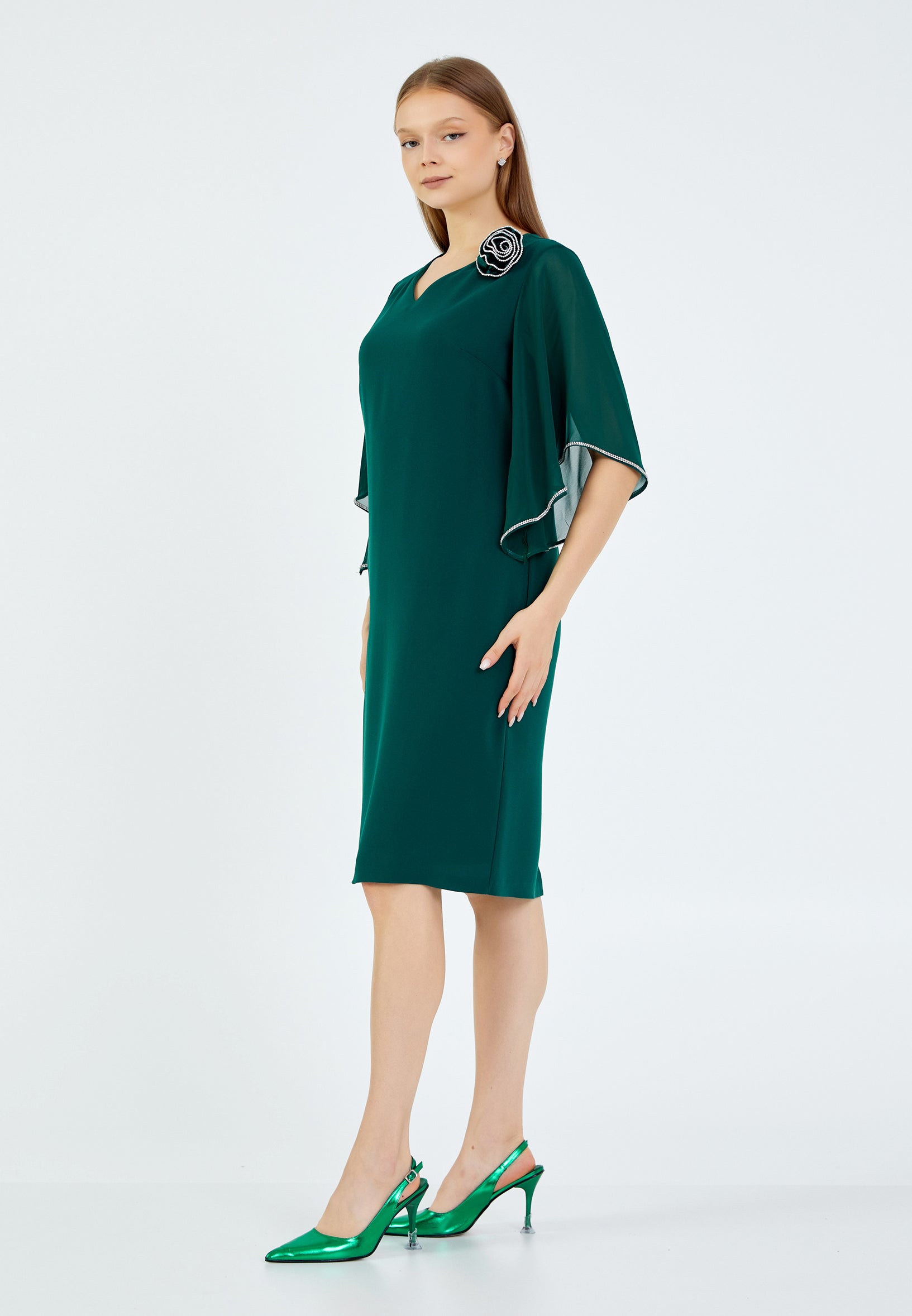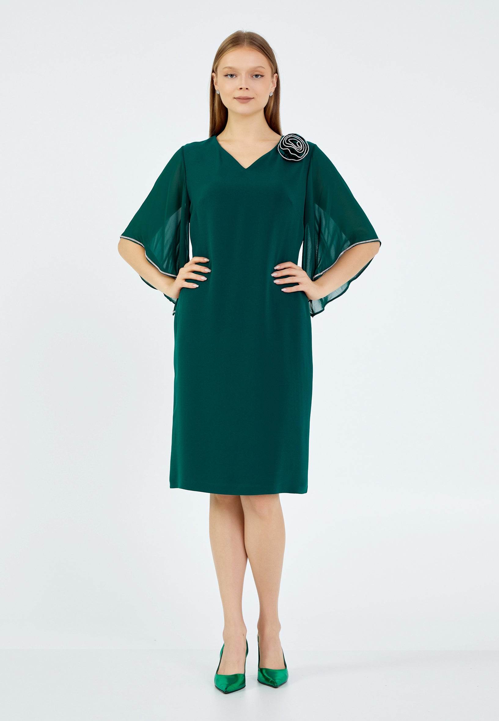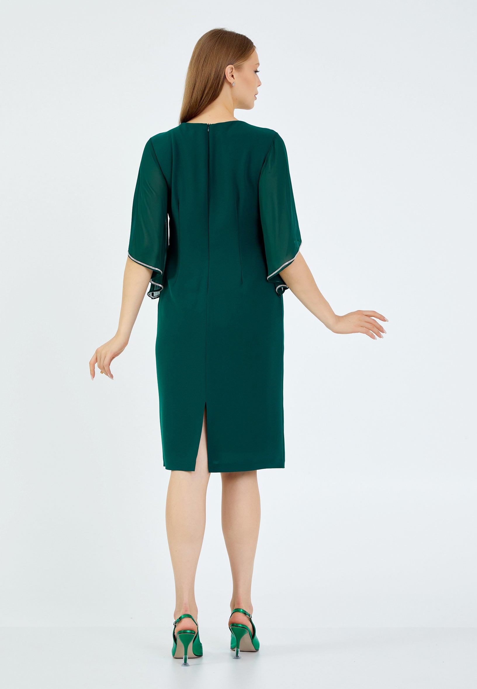 *Dark green pine chiffon dress with small v decolleté mid sleeves with crystal trims