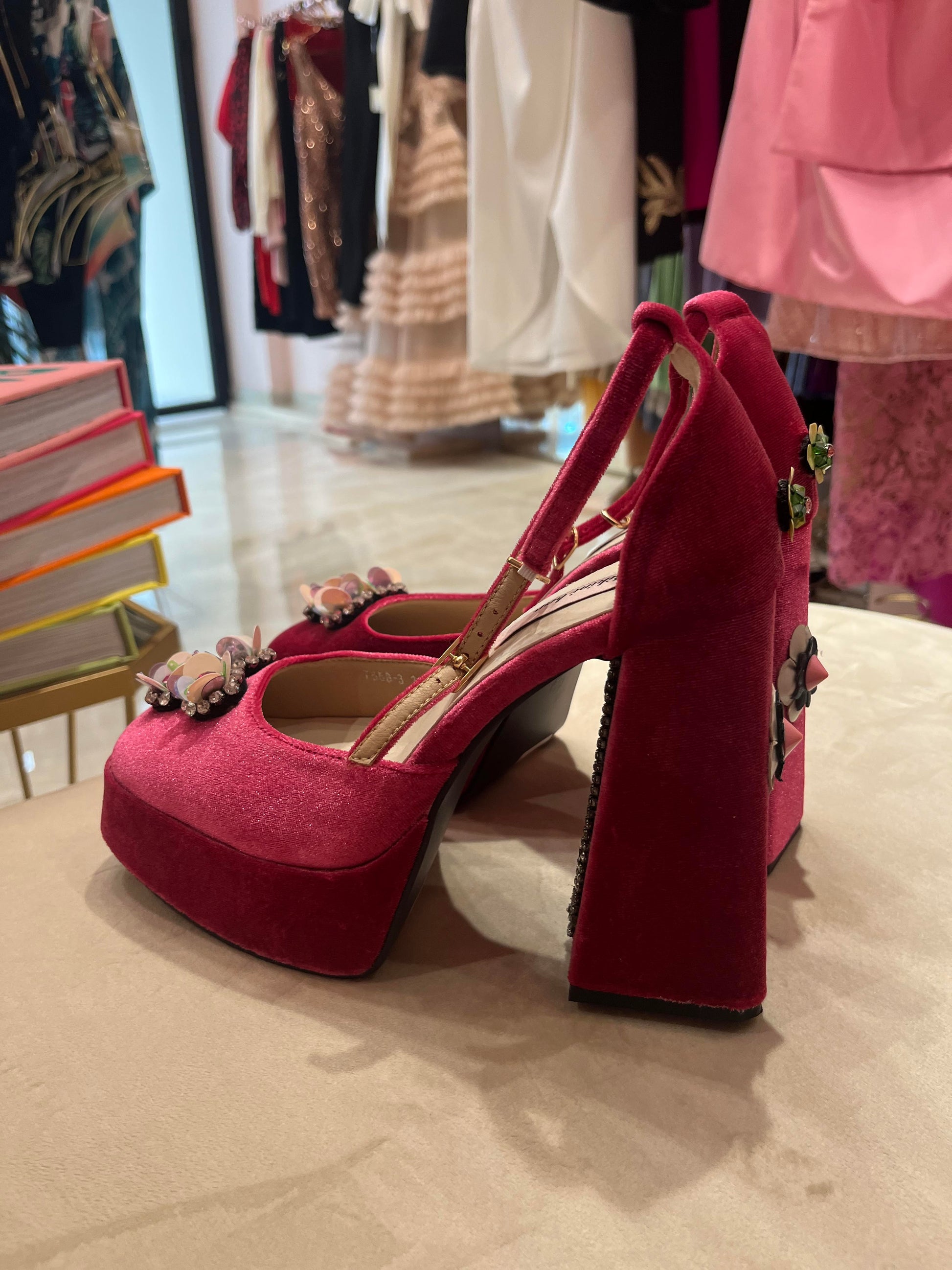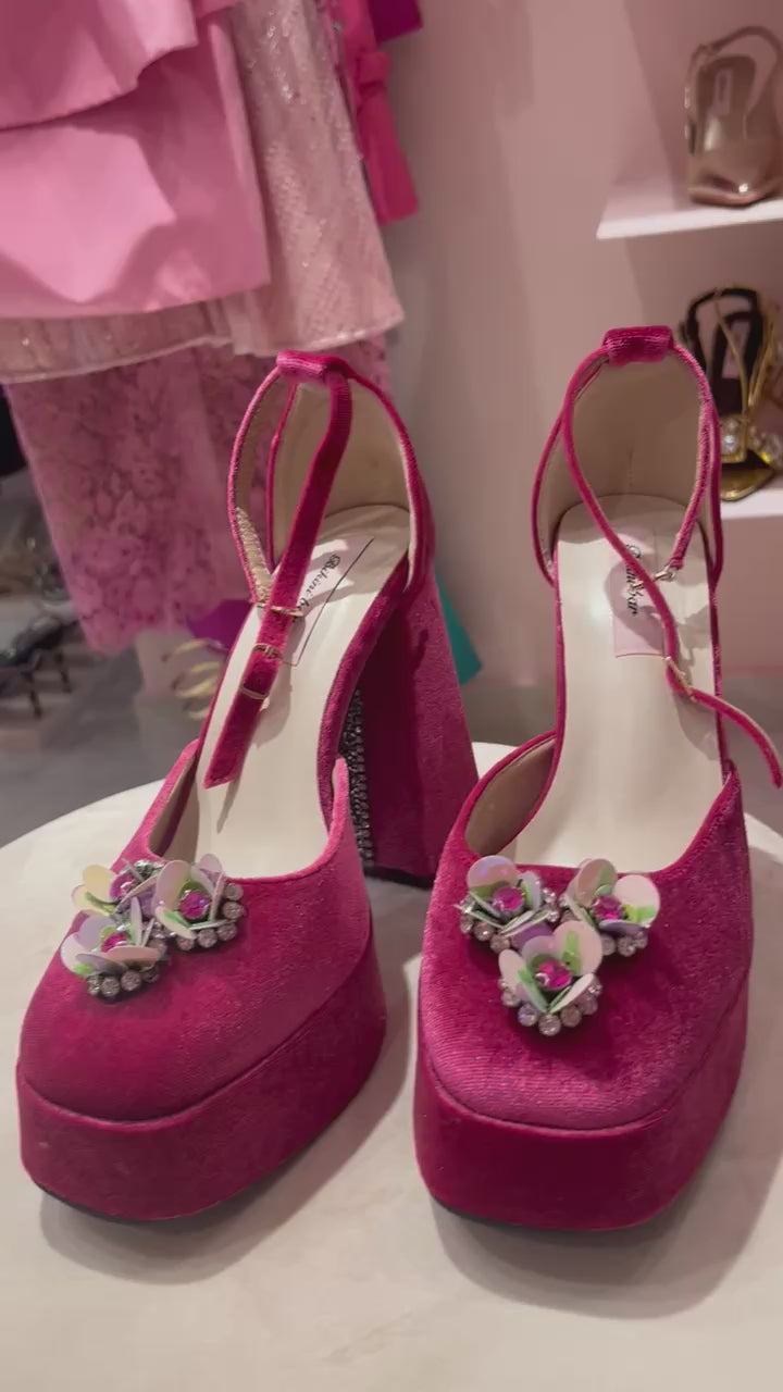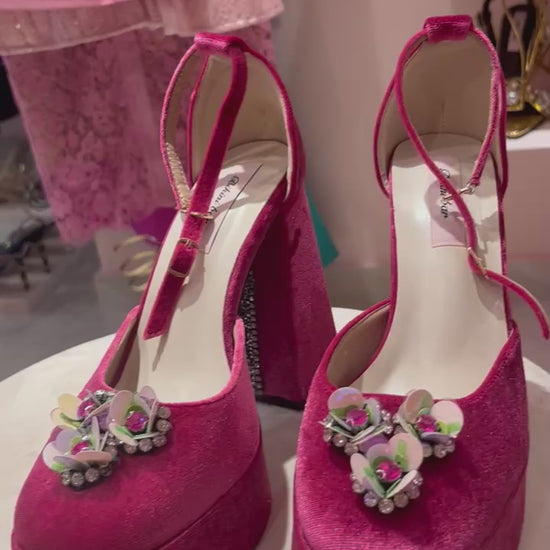 Framboise pink plateform velvet heels detailed with flowers made of crystal leather and sequins appliqué