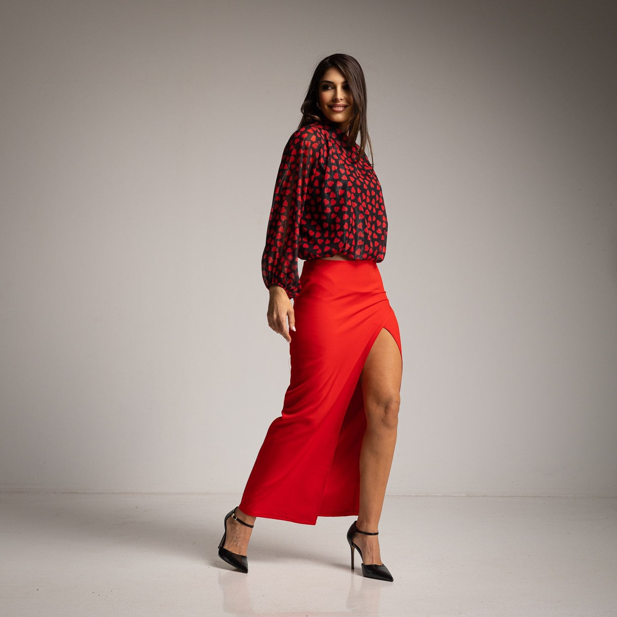 *Camisa de vestir con estampados de corazones rojos y tela estampada negra*Material: Elastana de viscosa
