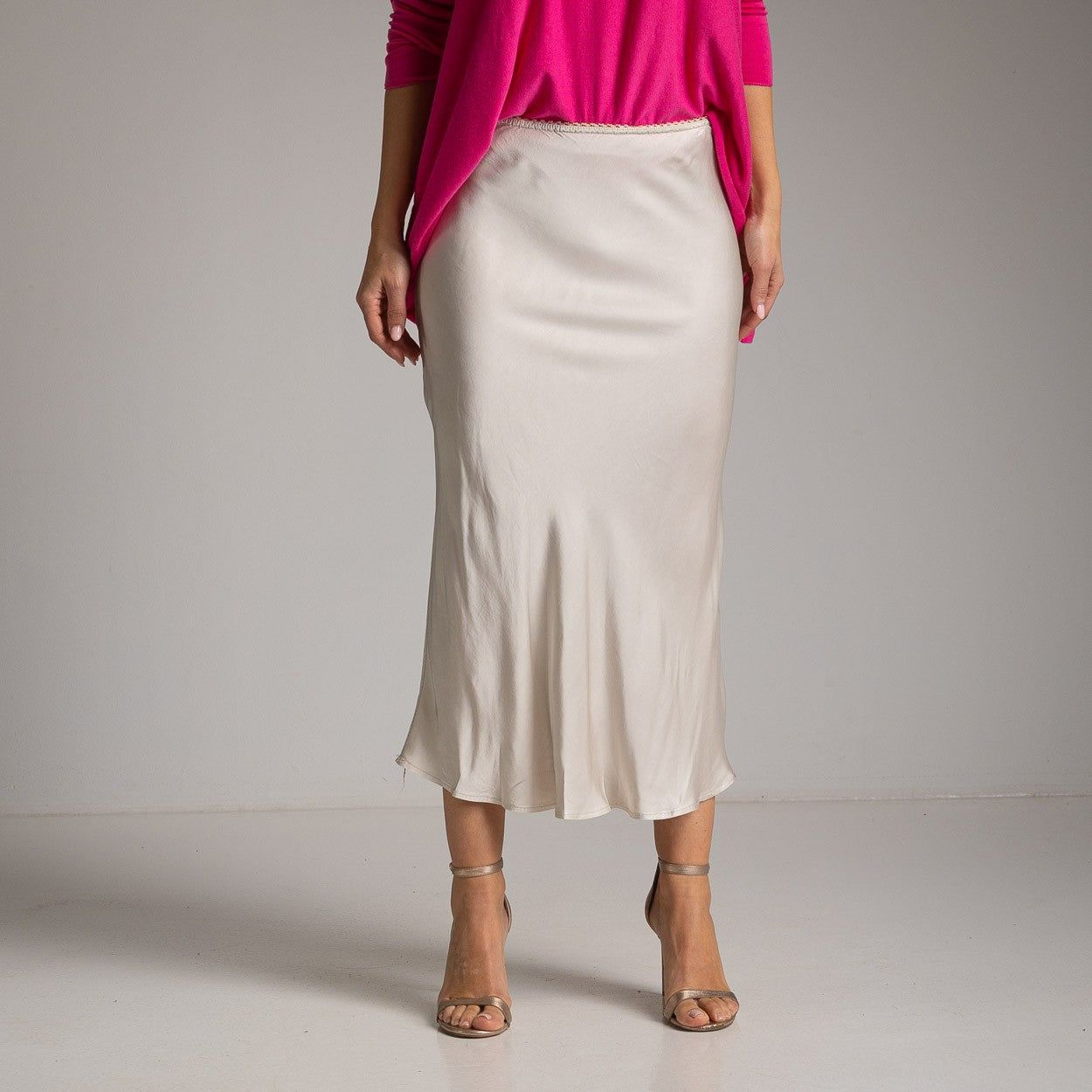 *Falda larga con cinturilla elástica confeccionada en tejido sedoso satinado color beige claro