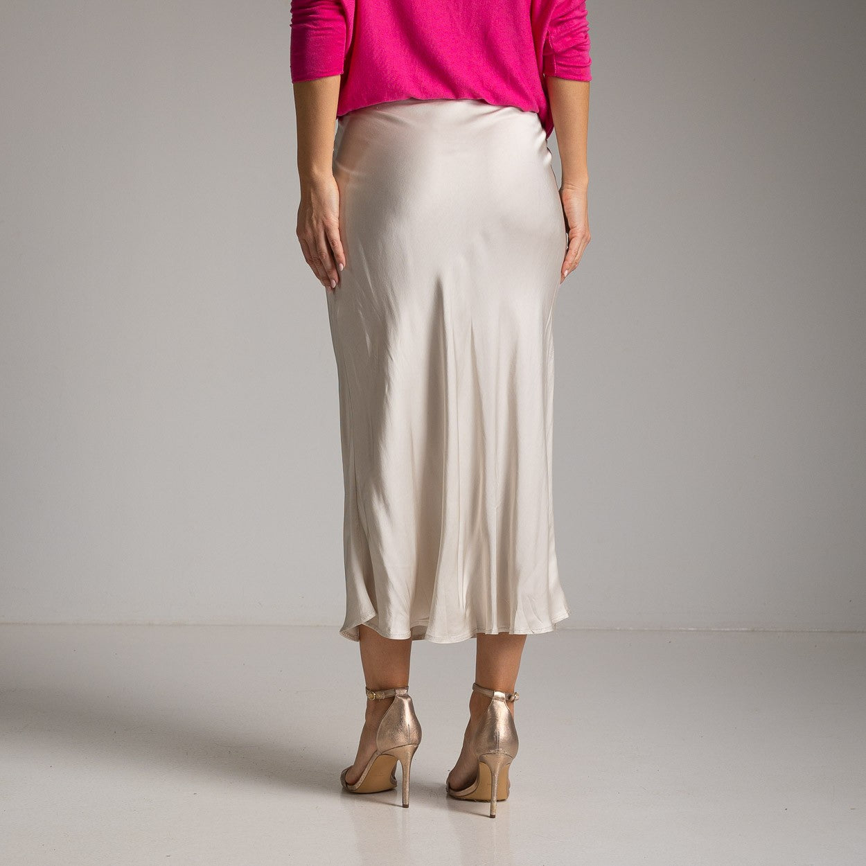 *Long skirt with elastic waist band made of a light beige satin silky fabric