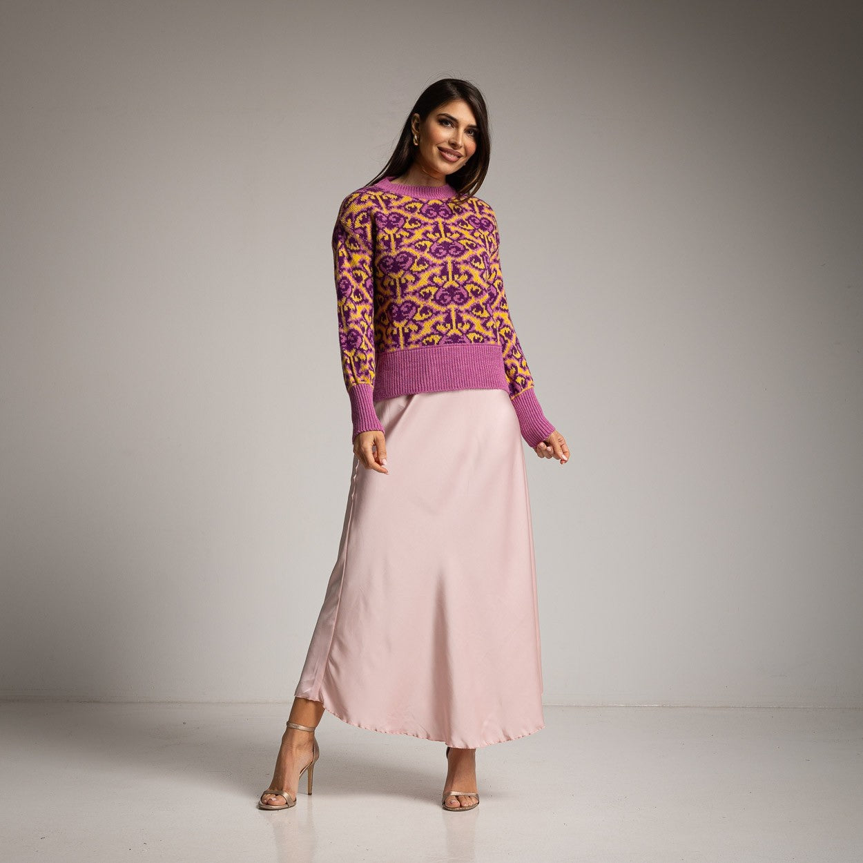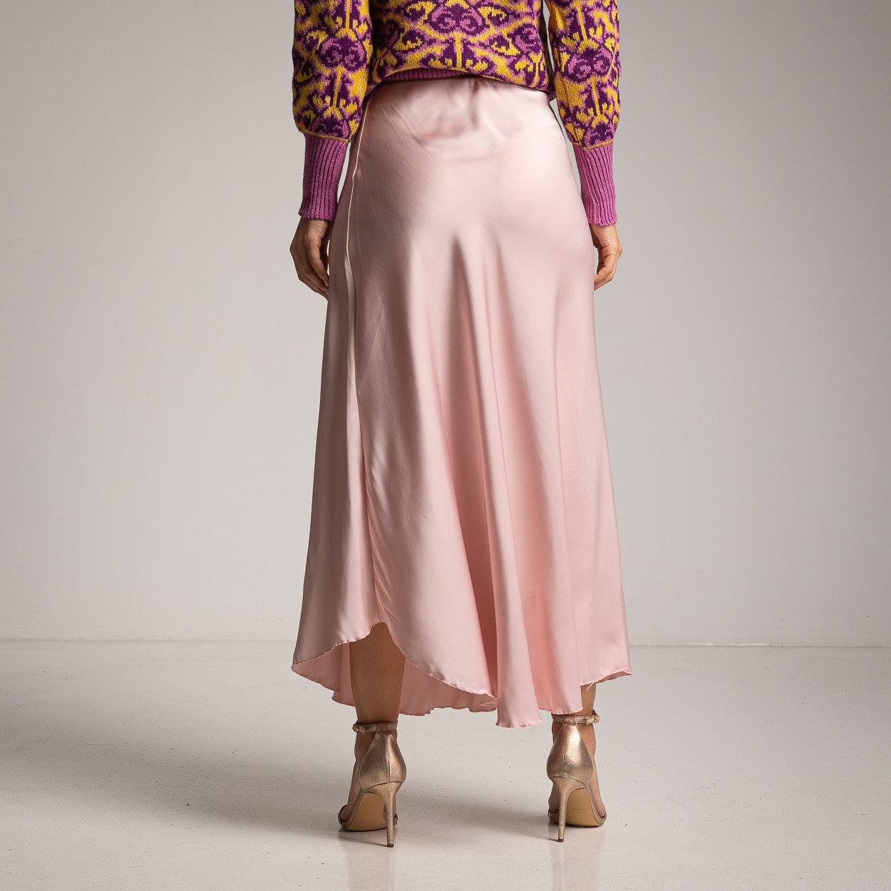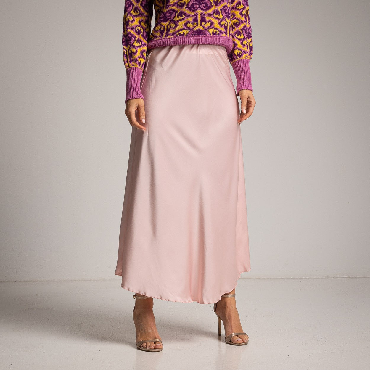 *Falda larga con cinturilla elástica confeccionada en tejido sedoso satinado color rosa claro
