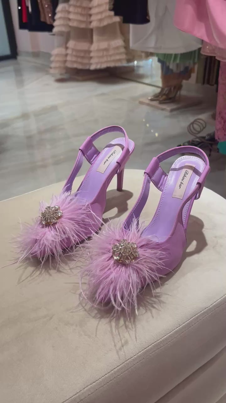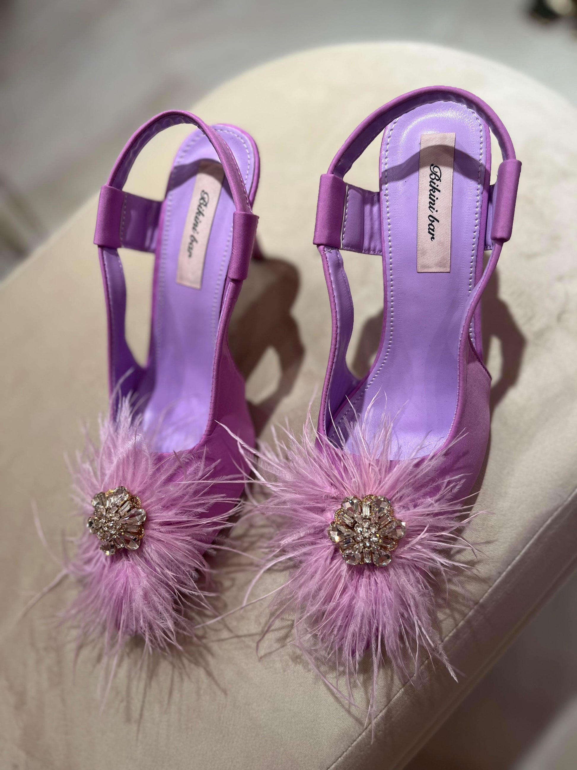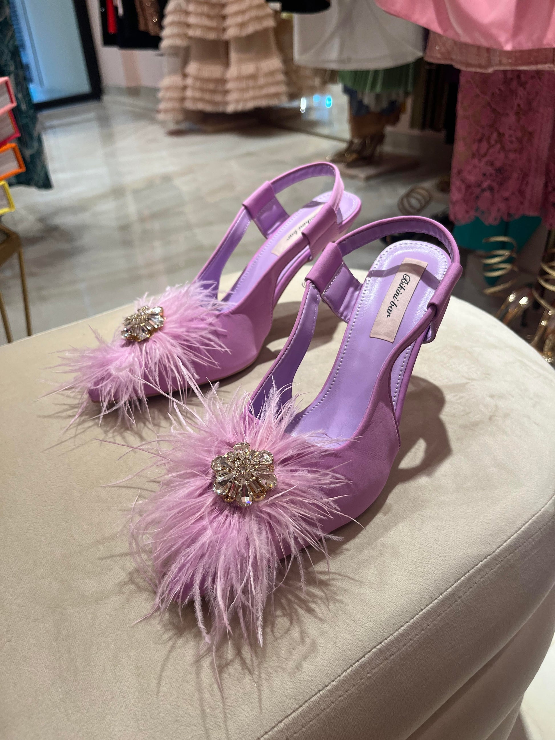 Tacon de satén mate lila morado con la espalda abierta y plumas de avestruz lila y ribete de cristal