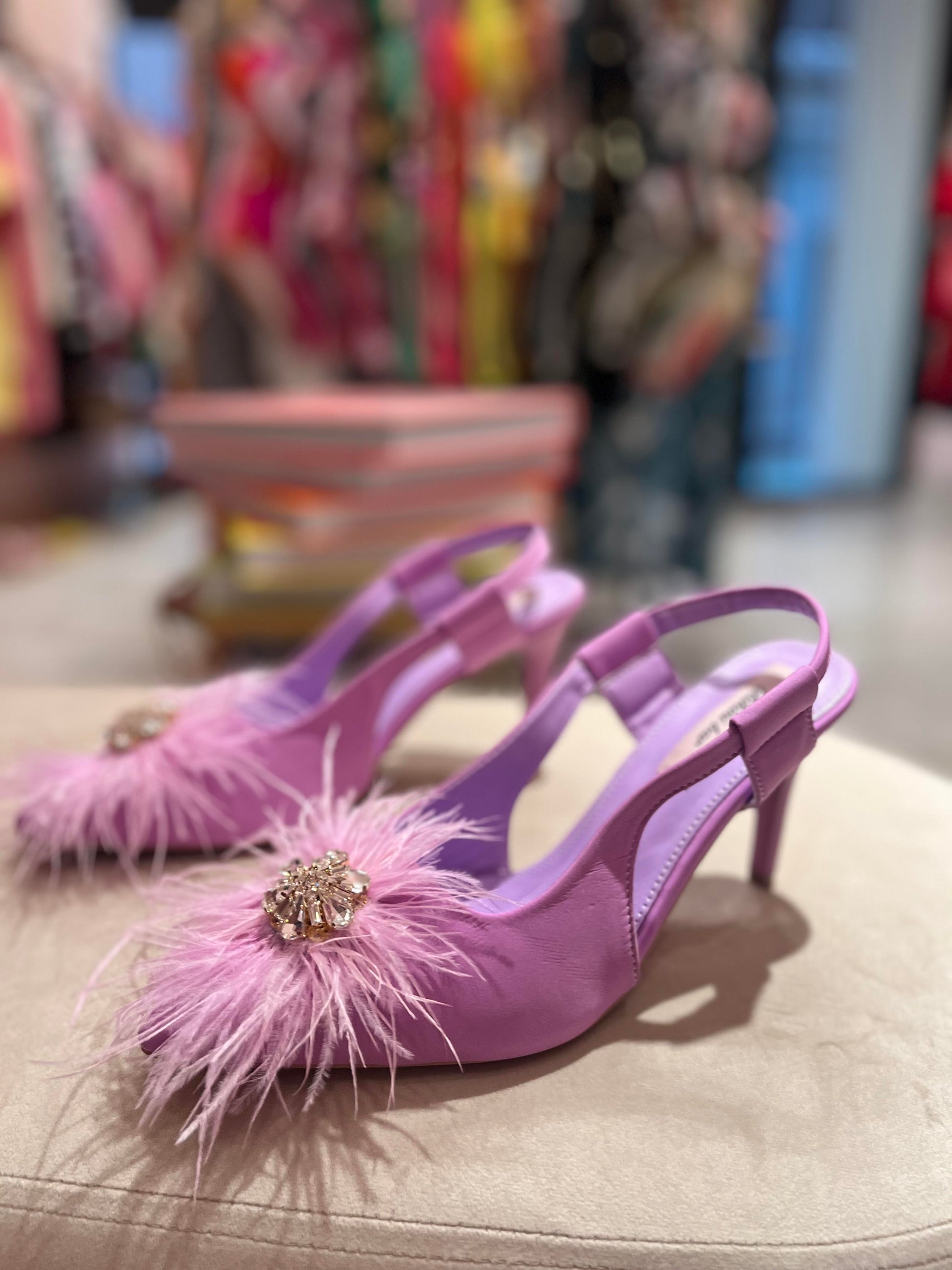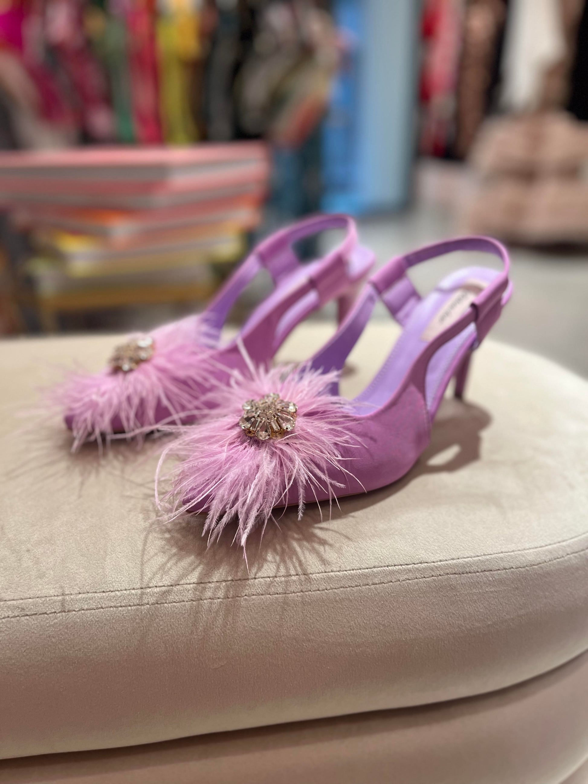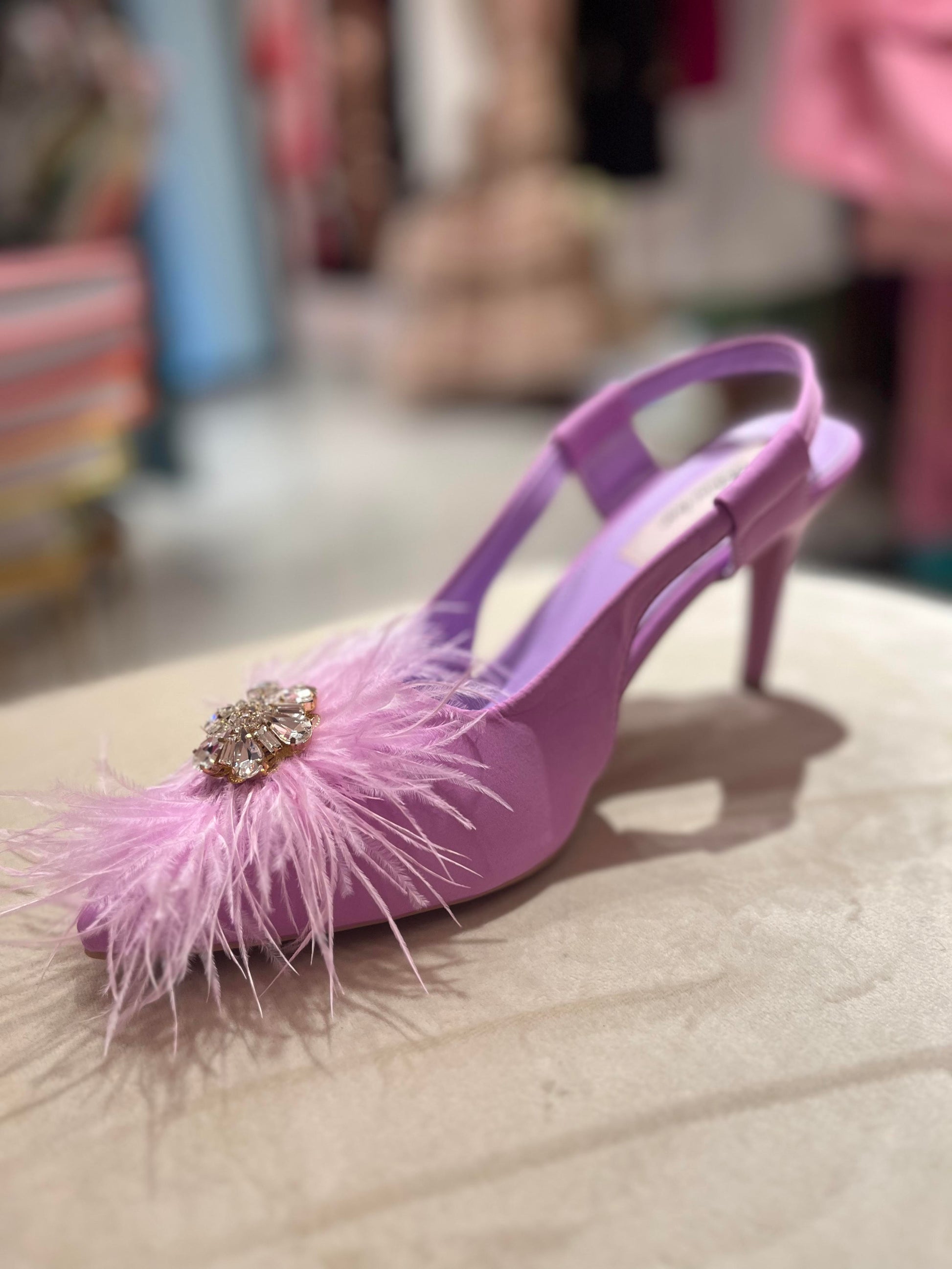 Tacon de satén mate lila morado con la espalda abierta y plumas de avestruz lila y ribete de cristal