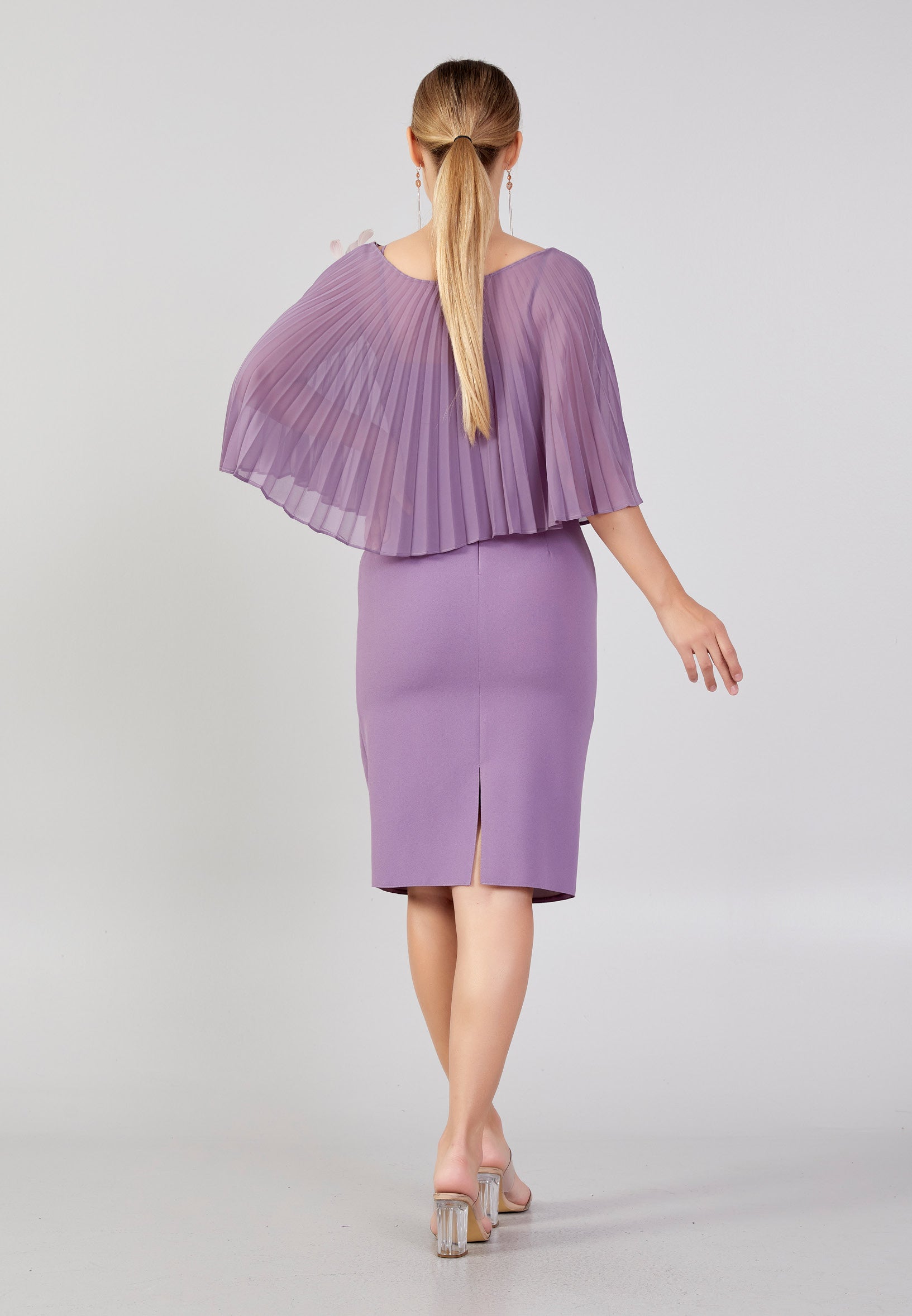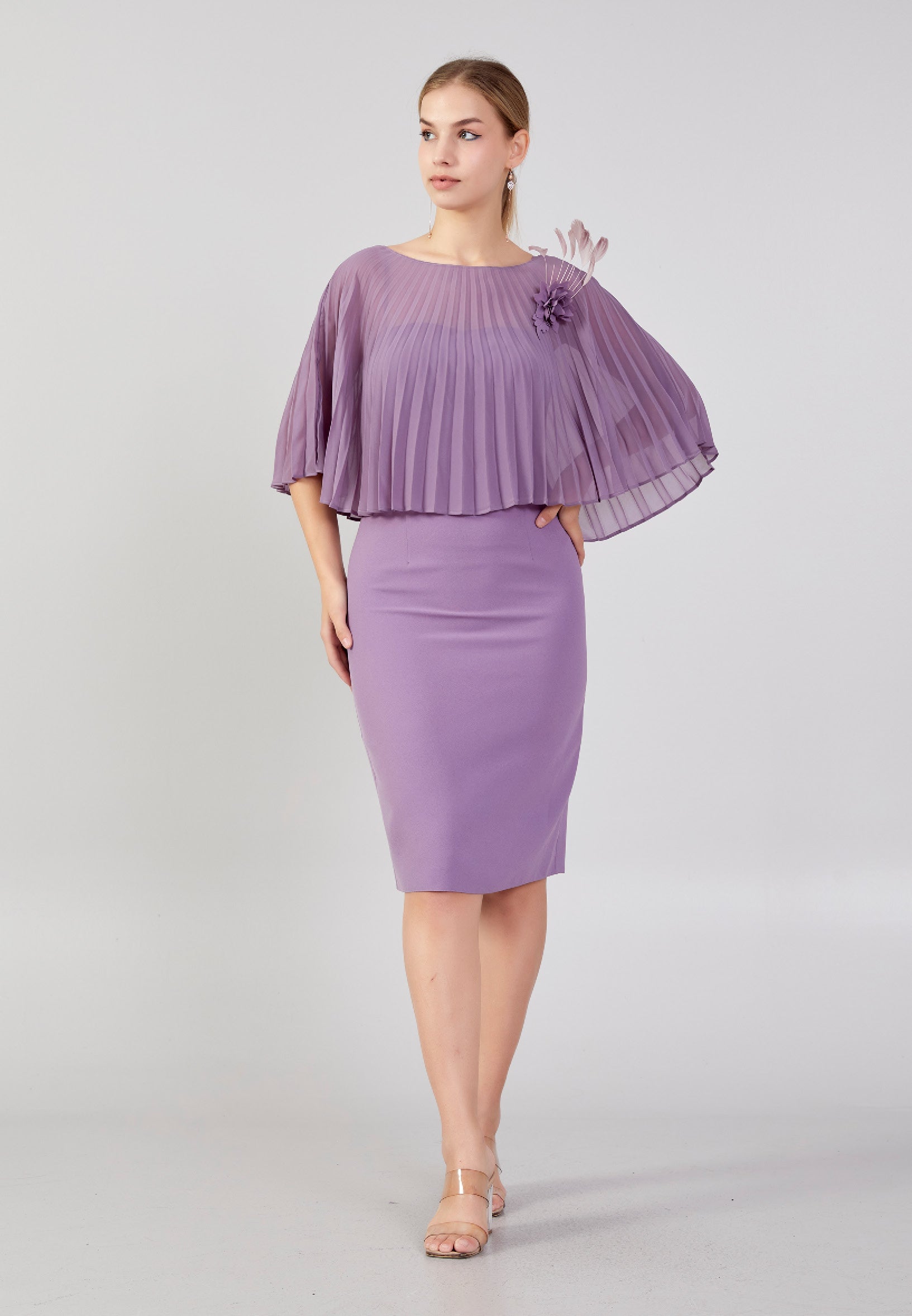 *Vestido de gasa plisado lila morado con ribete de plumas y falda inferior ajustada