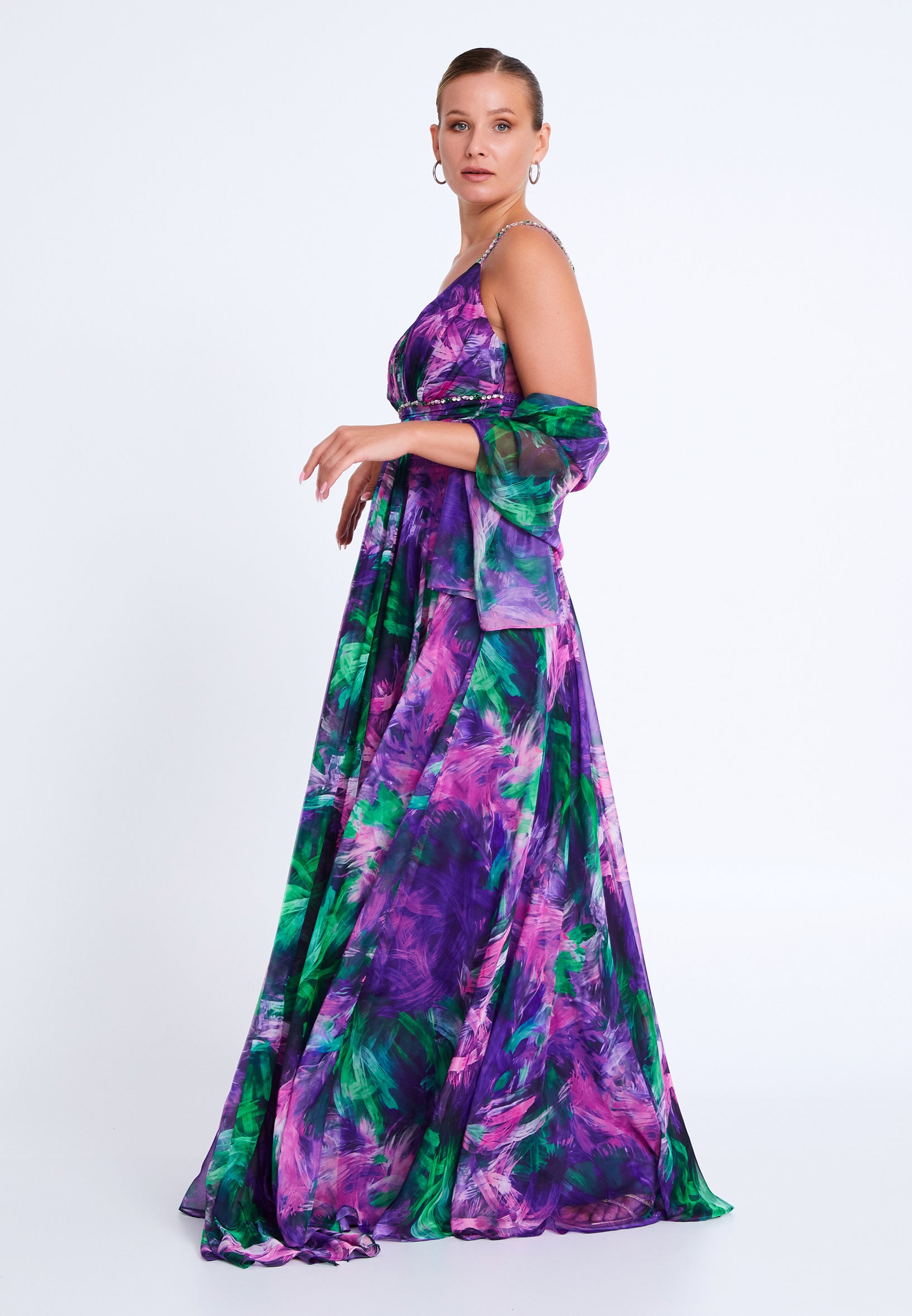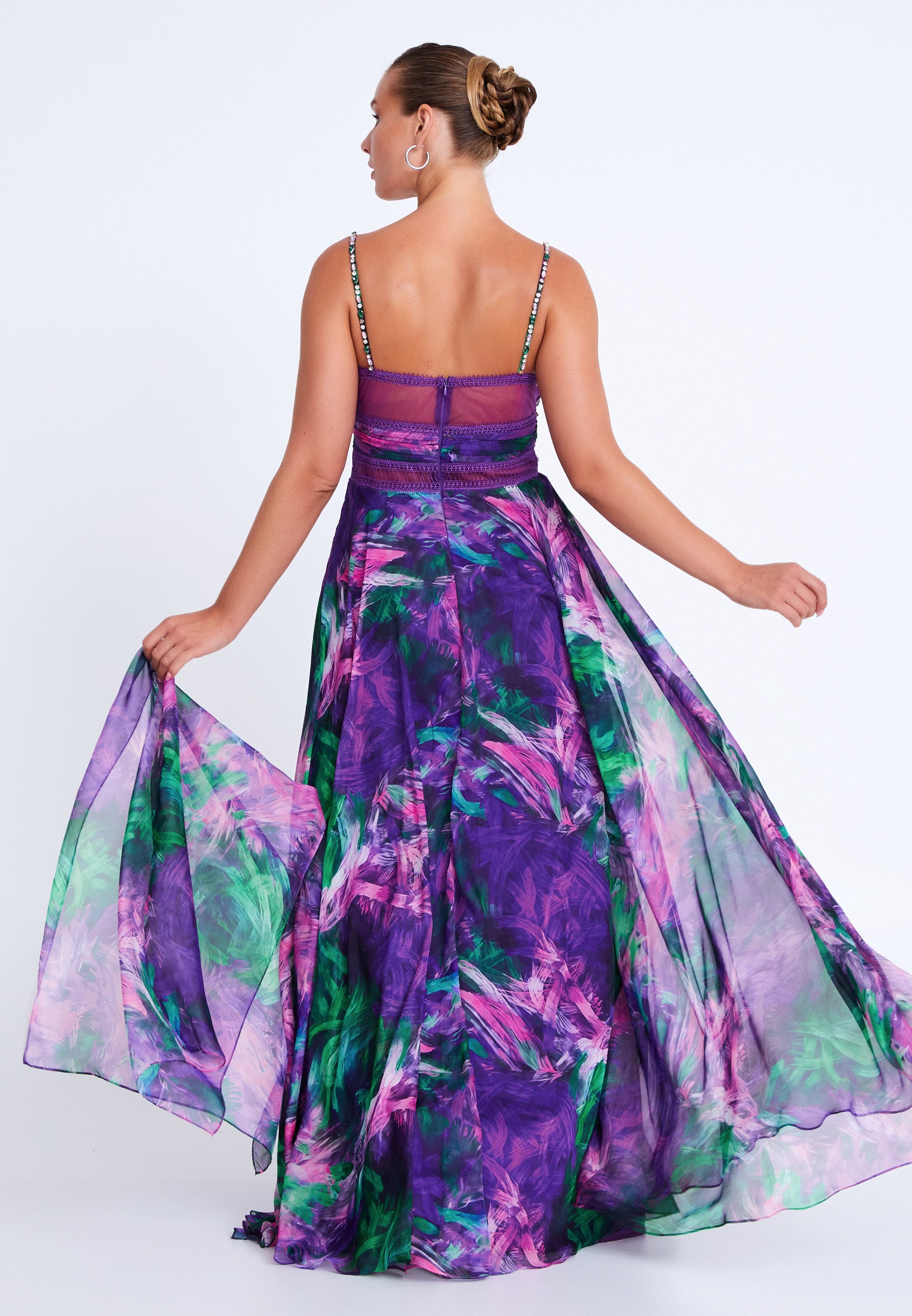 *Long silk chiffon tropical print evening dress with strapy crystals trims and a