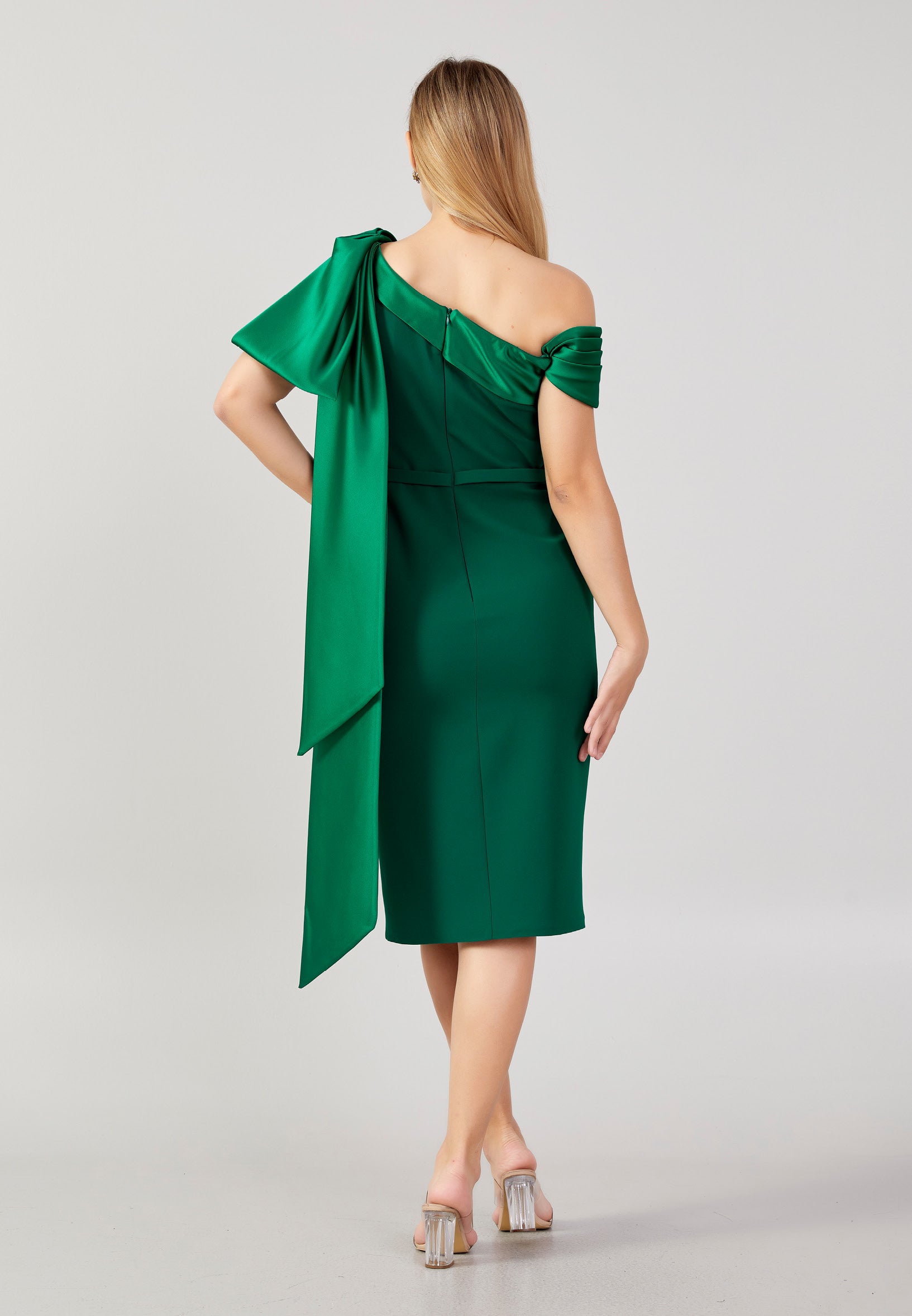 *Vestido midi con lazo y hombro asimétrico en crepe verde esmeralda