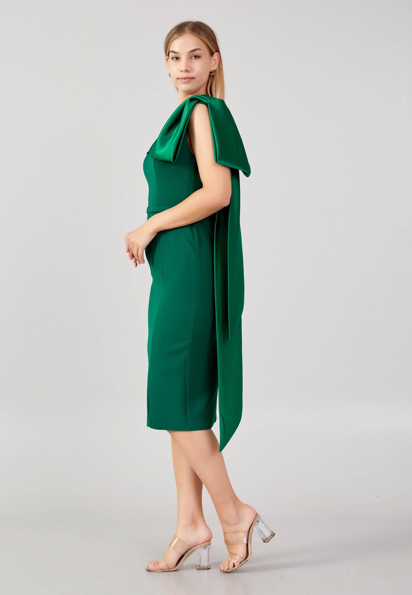 Emerald green crepe satin bow and asymmetric shoulder midi dress