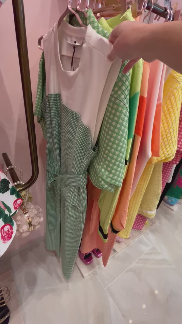 *Vestido de día verde vichy midi mezclado con top de algodón blanco y cinturón y solapa vichy