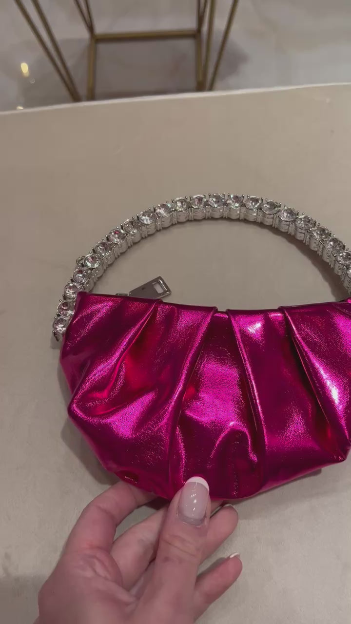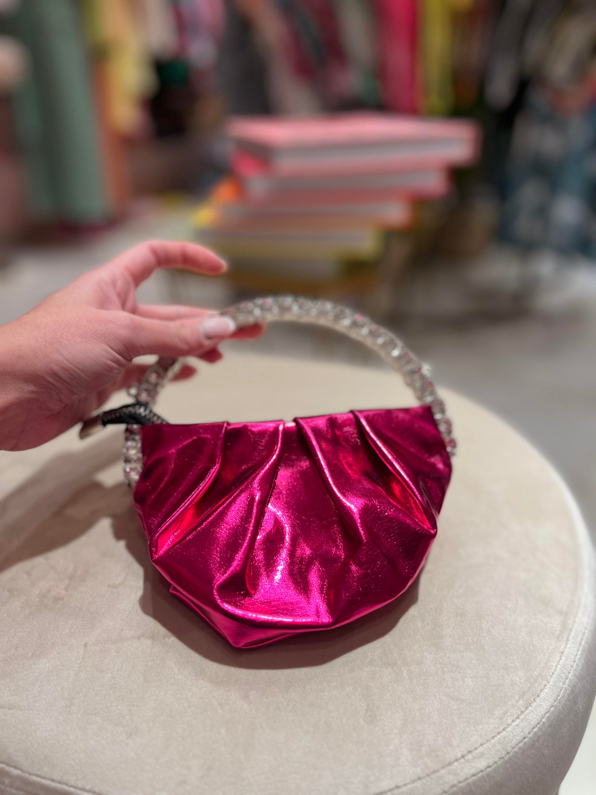 * Mini bolso de cuero fucsia metálico con asa de muñeca de metal cristalino