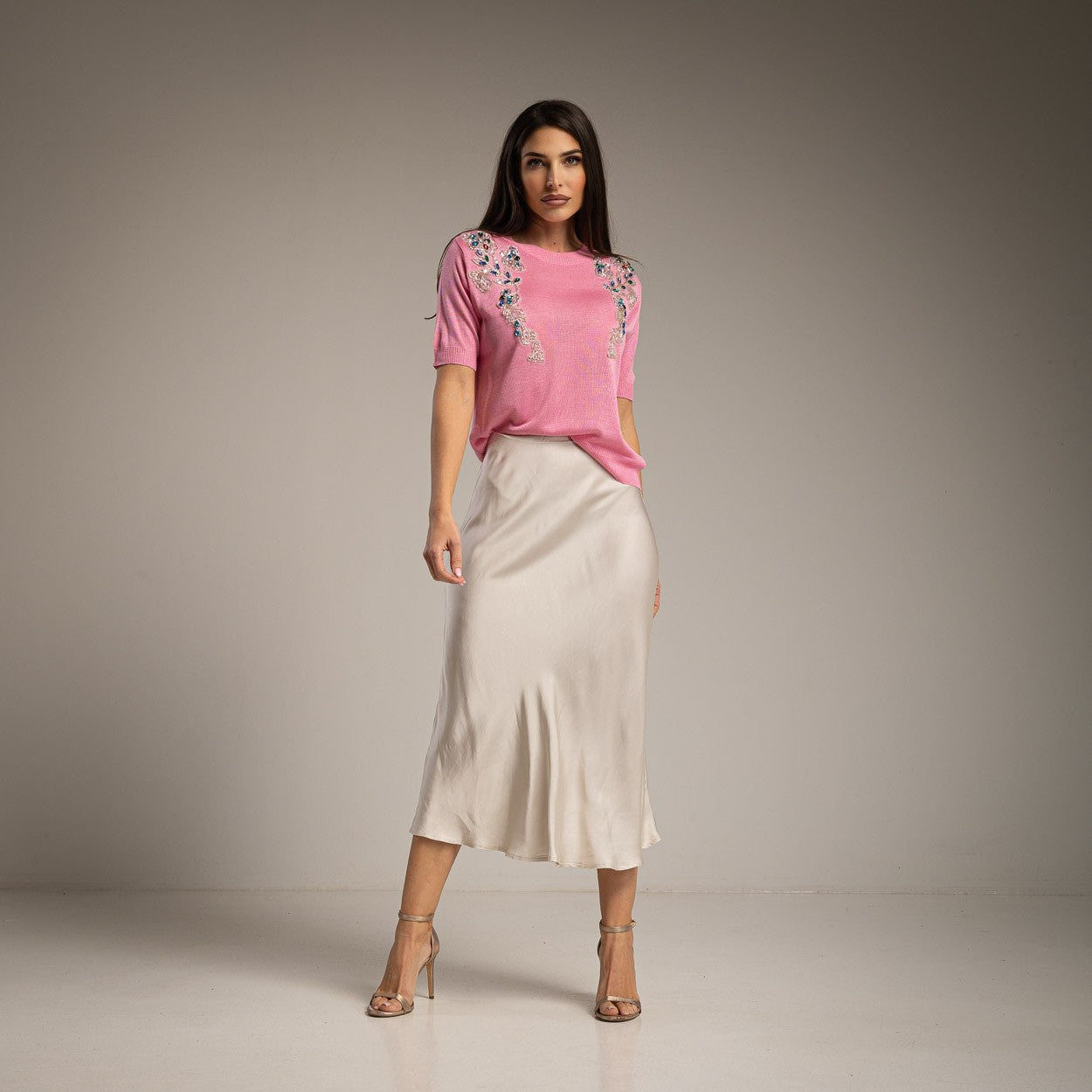 PINK JERSEY WITH CRYSTALS EMBROIDERED FLOWERS
