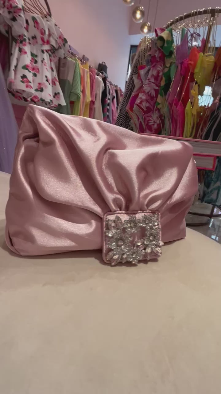 *BOLSO DE NOCHE ROSA EMPOLVADO SATINADO CON HEBILLA METÁLICA CRYSTAL