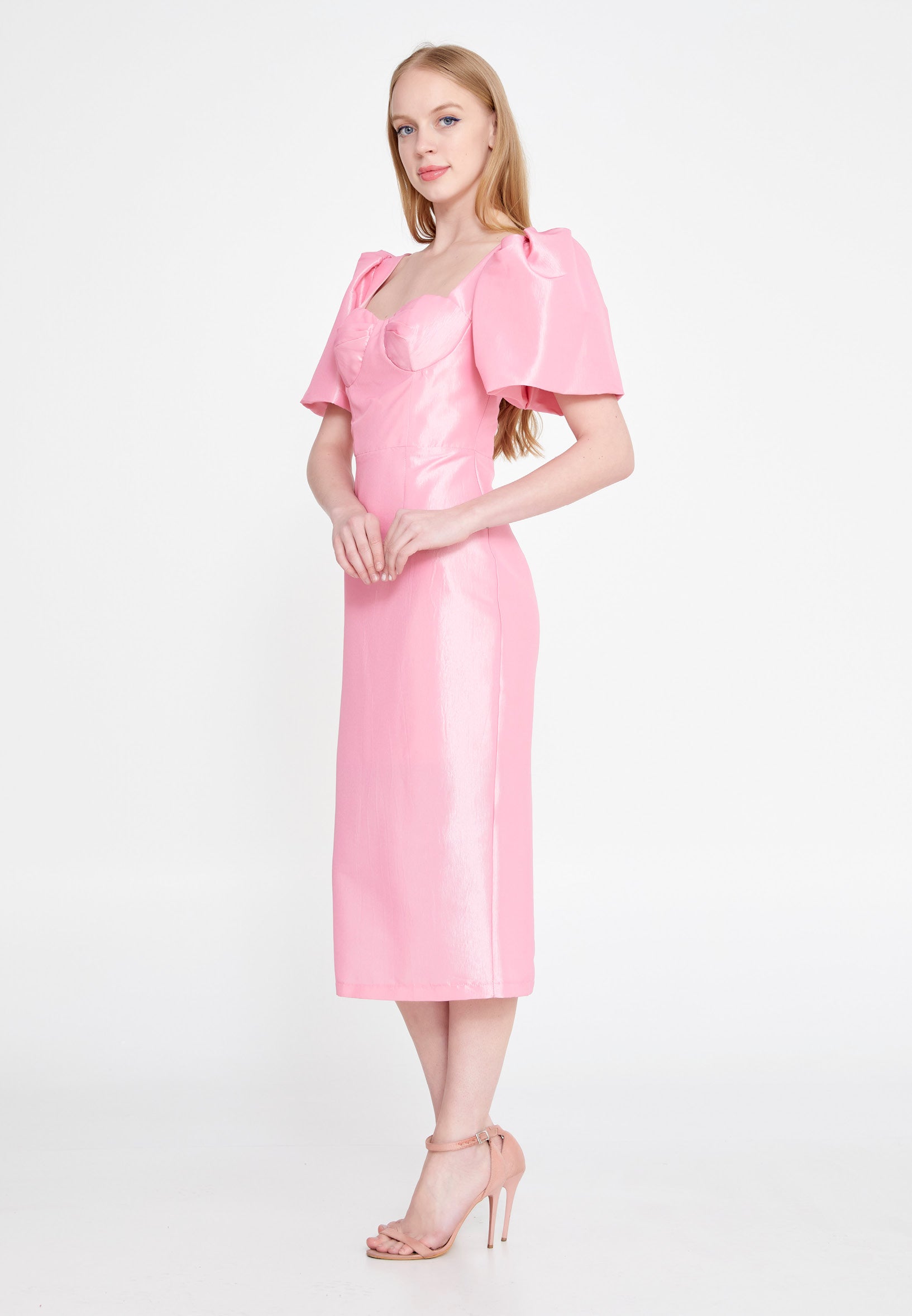 *Vestido bustier de tafetán rosa con mangas abullonadas.