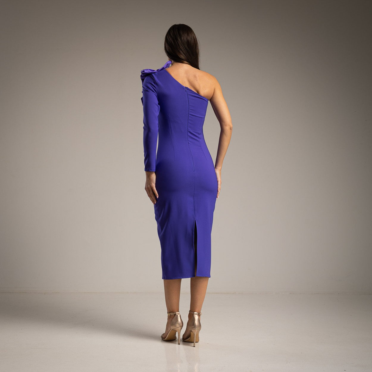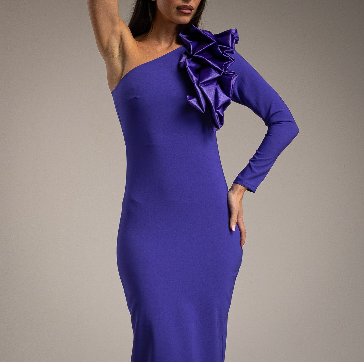 *Purple asymmetric one shoulder midi dress with purple satin ruffles on one side