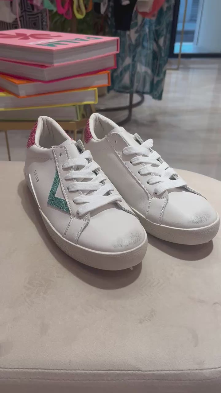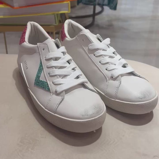 WHITE SNEAKERS WITH GREEN AND PINK GLITTERS TRIM