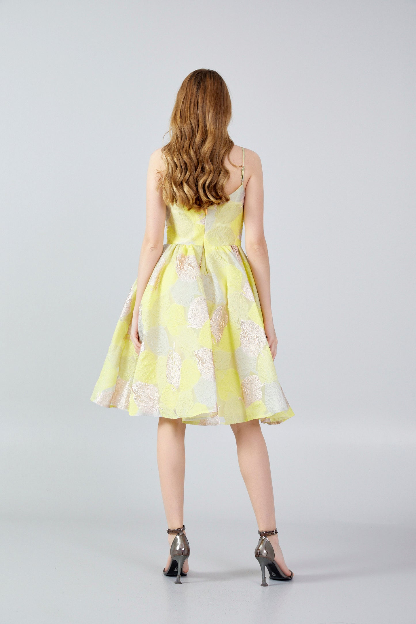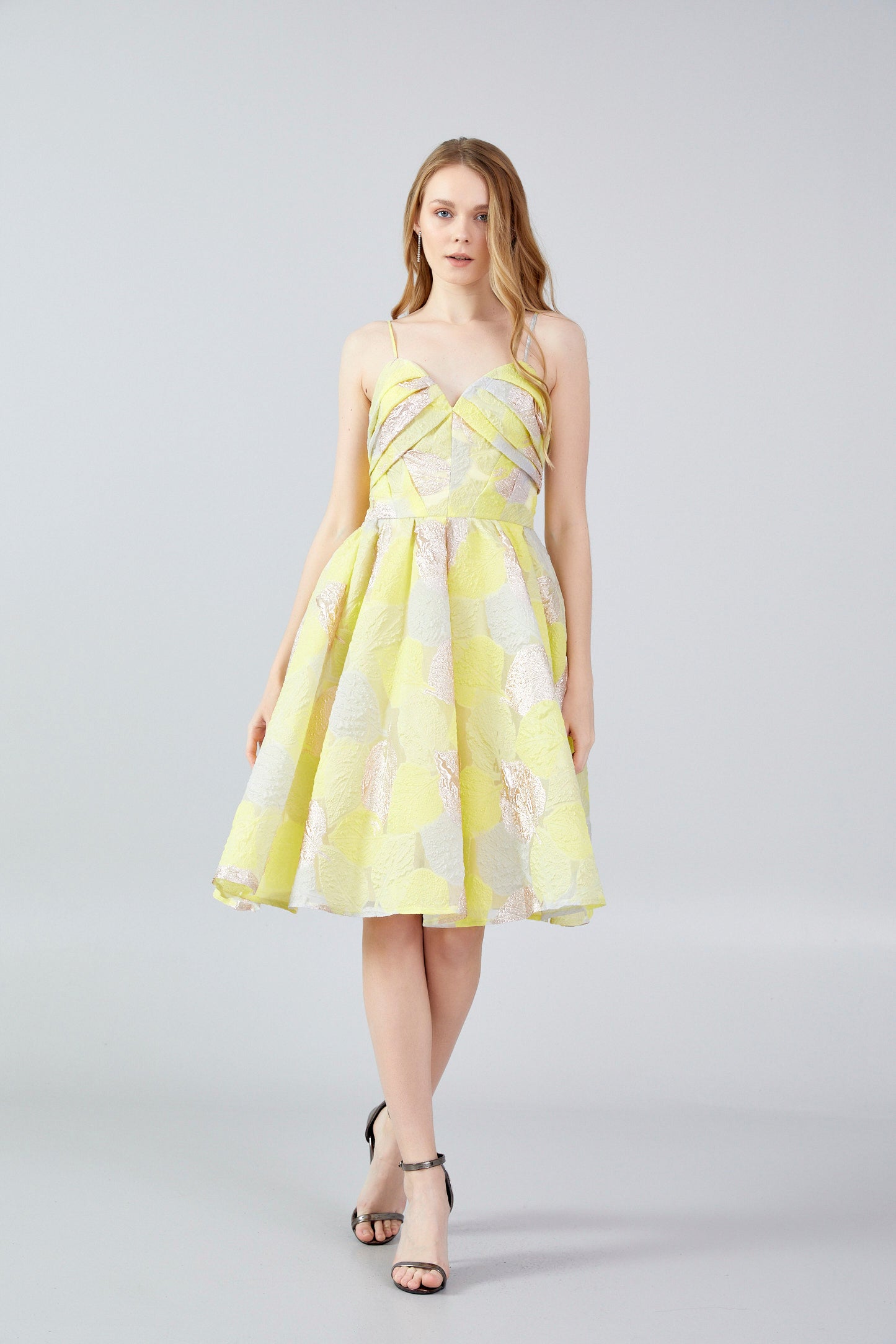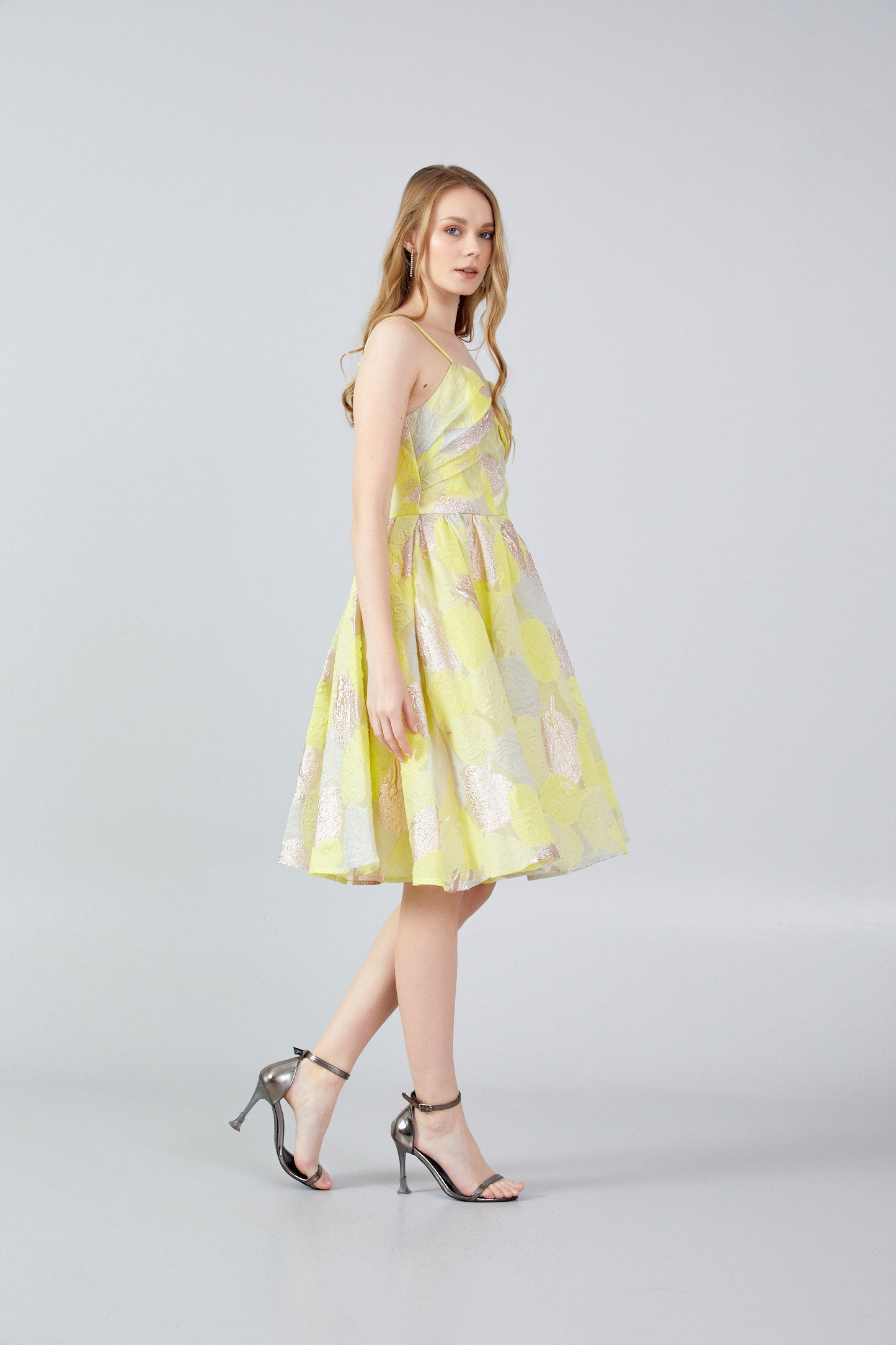 *Chic strappy little flared dress made of a yellow and gold organza fabric