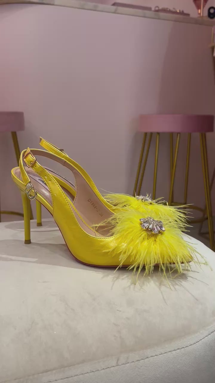 *Zapato amarillo con plumas y detalle de cristal